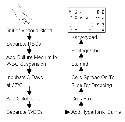 Briefly the procedure of chromosome culture from peripheral lymphocytes consists of firstly collecting a sample of intravenous peripheral blood using sterile equipment and procedures into a sterile heparinised container. The sample is next treated with growth promoting culture media containing essential ingredients including balanced salt solutions and a substance called Phytohaemagglutinin (PHA) which is a mitogen that stimulates cell division. Fig. 15. These steps are carried out in a sterile laminar flow cupboard, using sterile techniques and sterile containers. The resulting mixture is next incubated at 37 degrees Celsius for three days. Shortly before the end of this period of time, the culture is treated with a spindle poison called colchicine which inhibits the spindle. The medium is next replaced with hypotonic saline to swell the chromosomes and next fixed using a mixture of alcohol and acetic acid.
