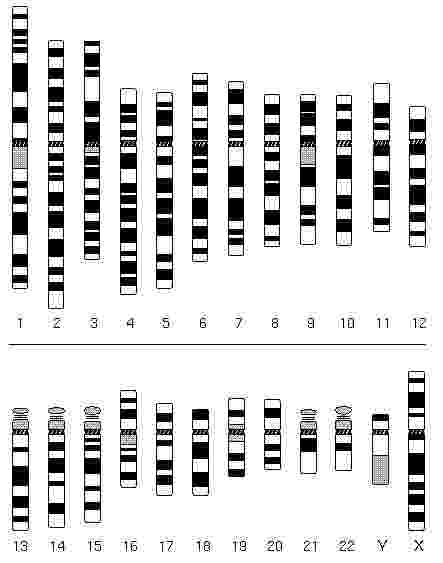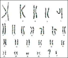 The slides are then examined and spreads (groups) of 46 are analysed. The good spreads are selected and photographed using a photomicroscope. The film is now developed, the photographs printed and the individual chromosomes are next cut out and arranged in pairs in decreasing order of size, and numbered from 1 to 22 with the sex chromosomes separate. This photographic representation of the entire somatic chromosome complement is referred to as a KARYOTYPE. Fig. 17. A normal female karyotype is denoted as 46, XX and that of a male as 46, XY. The main bands and the sub bands are numbered beginning from the centromere and moving towards the tips of the chromosome and the missing or exchanged or rearranged bands are denoted in the final formula. Fig. 16.