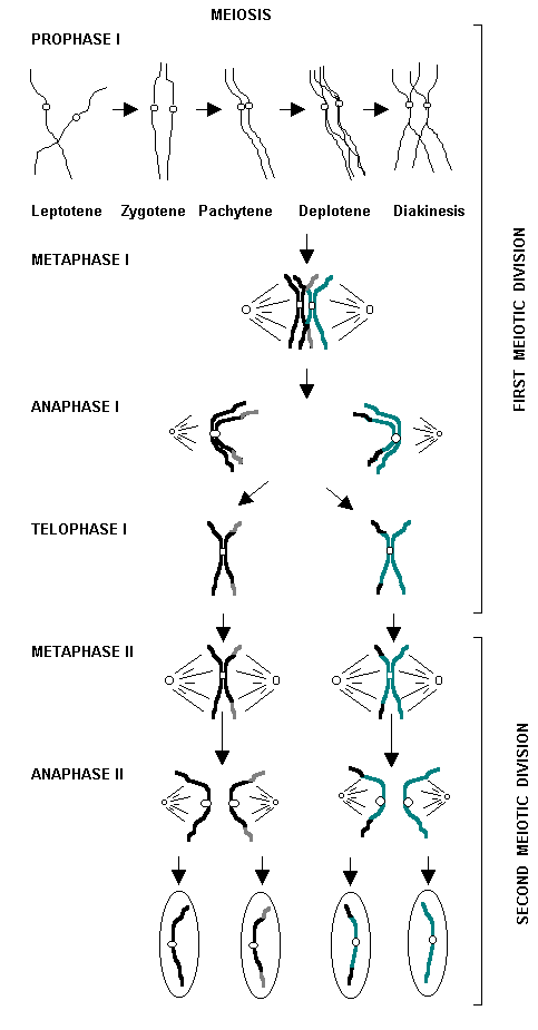 At the commencement, the diploid cell with its completed DNA replication and 46 chromosomes, each with its sister chromatids enters prophase I. The first substage is called leptotene, when the chromosomes first become visible as threads, with the chromatids unable to be distinguished. Zygotene follows where the homologous chromosomes (paternal and maternal ones ) pair off along their lengths side by side. The synaptonemal complexes now appear which will assist in the synapsis and crossing over of chromosomal material. In the next substage of pachytene, the chromosomes condense further, the chromatids (four) are visible forming tetrads and recombination takes place between homologous chromosomes through crossing over. It is here that paternal and maternal recombination of DNA occurs to produce the wide variations seen in humans. In the diplotene stage, the homologous chromosomes begin to separate but are held together at the points of crossing over like crosses, referred to chiasmata. In diakinesis which follows, the chromosomes reach maximal condensation.