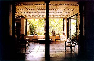 B R I E F J O U R N E Y TO VISIT BRIEF FROM COLOMBO, take the Galle Road south along the coast to Alutgama, just half a mile short of the popular resort town of Bentota. At Alutgama junction, turn left and pass through the predominantly Muslim community of Dharga Town, avoiding the potholes, pedestrians and careering white-capped cyclists. Beyond the town, look for a turning to the left marked by a yellow wooden sign; the sign is quite small - keep your eyes peeled- and says "Brief" in ornate red letters. Follow the road for about two kilometres. The next turning is on the right, and marked by another red-and yellow sign saying "Brief Short Cut." It marks a narrow road that ends at the Bawa estate. One more sign saying "To gardens" points up the drive to Bevis's front door. If in doubt at any point, ask; all the locals know Bevis. The gardens are open to the public. There is a small entrance fee.