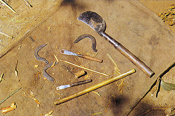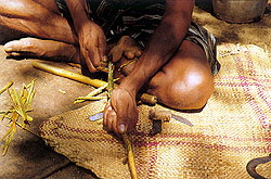 The most difficult part of cinnamon production starts the next day. Seated on the floor of the peeling shed, the peelers snip off the leaves and twigs, and scrape off the rough outer bark from the twigs. The inner bark is then rubbed and beaten down thoroughly with a smooth brass block to break up and homogenize the tissues and free the bark from the twigs. Then the peeler, using the distinctive tool of his trade, a small curved knife called a kokaththa, deftly marks two parallel slits on the stick and eases the bark free in one piece. Experienced peelers do this swiftly and with the precision of a surgeon, making clean and true cuts - all without fragmenting the bark. Next, the barks are carefully packed in layers, one inside the other, in several plys, telescoped and overlapped end to end to produce long, rolled and layered "quills."