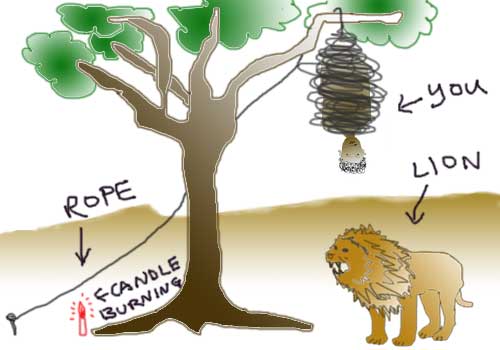 Imagine you are in Africa. You have been tied hanging on a tree with a rope anchored on the ground, a candle is slowly burning the rope, and the lion is waiting for you to drop and be his lunch.