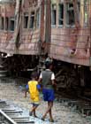 Feb 28 (Yahoo) Sri Lankan children look at wrecked coaches of a tsunami-hit train in Peraliya, southern Sri Lanka, February 27, 2005.