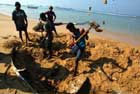 Jan 14 (PBP) On the beach on Jan. 12, men work to dig out a fisherman's boat that was buried in the sand during the tsunami. Fishing communities around the Indian Ocean were hit hardest by the Dec. 26 tsunami.