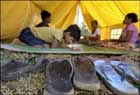Jan 26 (GI) Utshala Sudershini (C) and her twin sister Utshala Priyadarshini (L) study while sitting in a tent with their grandmother (2R) and mother (R)at Rajjipura Refugee Camp in Galle,