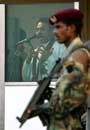 Oct 1 (AP) Prime Minister and presidential candidate of the ruling coalition government Mahinda Rajapakse addresses the public from a bullet proof cubicle as a soldier stands guard in the foreground in Akkaraipattu, about 200 kilometers east of Colombo,