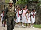 Jan 6 (Reuters) An armed Sri Lankan government soldier stands guard on a street as Tamil student's walks to their school in Jaffna, northern Sri Lanka, January 6, 2006.