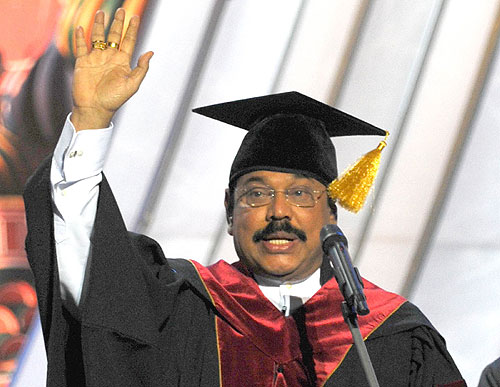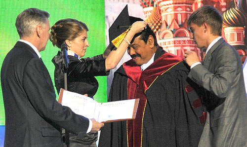 Sri Lanka President Mahinda Rajapaksa was awarded a Honoris Causa Doctorate by the Peoples’ Friendship University (PFU), formally known as Patricia Lumumba University of Moscow in Russia on Saturday 6th February 2010 at 6.00pm.