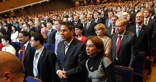 The PFU is celebrating its Golden Jubilee and to mark the anniversary it has been decided to award the Honorary Doctorate to President Rajapaksa for his contribution for world peace and outstanding success against defeating terrorism. The award ceremony was held at the conference hall of the Great Kremlin Concert Hotel in Moscow. Head of the University Rector Professor Vladimir M. Filippov presented the President with a diploma at the ceremony. President Rajapaksa addressed the audience following the conferment. The conference hall was fully packed with more than 6000 invitees from over 100 countries. Several world leaders, including Guyana President Bharrat Jagdeo also attended the ceremony. The People’s Friendship University (PFU) was established by the former USSR government on 5th February 1960. On 22nd February 1961 it was named after Patricia Lumumba, a political and public figure, a poet and also the head of the first Peoples’ Democratic Government of Congo. The university was re-named as “Peoples’ Friendship University of Russia on 5th February 1992. Since 1995 PFU has awarded ‘Doctor Honoris Causa’ to distinguished persons for outstanding academic achievements in the fields of science and education and to world leaders in recognition of their contribution towards fostering world peace. The awardees include five (5) Presidents and two (2) Prime Ministers from around the globe. The official letter informing of the awarding of this degree was handed over to President Rajapaksa by Minister of Foreign Affairs of the Russian Federation, Sergey Lavrov, during their meeting when he visited Sri Lanka recently. President Mahinda Rajapaksa will meet the Russian President Dmitry Medvedev on Monday. Also on the same day at the Russian Ministry of Finance, there will be a US$ 300 million credit line signing ceremony. President Rajapaksa is also scheduled to hold bilateral talks with former President and the present Prime Minister of Russia Vladimir Putin, other government officials and the business community. The President’s entourage includes Madam Shiranthi Rajapaksa, Foreign Minister Rohitha Bogollagama,Minster of Export Development & International Trade Prof.G.L Peiris, Minister of Mass Media & Information, Enterprise Development & Investment Promotion Anura Priyadarshana Yapa, Education Minister Susil Premajayantha, Minister of Power Mahindananda Aluthgamage, Leader of the National Freedom Front MP Wimal Weerawansa and the Secretary to the President Mr.Lalith Weeratunga. Russian language speaking Sri Lanka’s Ambassador in Moscow Udayanga Weeratunga will host a reception at the Ritz Carlton Hotel and the 62nd Independence Day celebrations during the President’s visit to Russia. Here is the text of President Rajapaksa's speech of acceptance : It is with a sense of humility that I accept the most prestigious award of the "Doctorate Honoris Causa" of the Peoples' Friendship University of Russia. I do so because the accomplishments mentioned in the citation stem not from my individual effort but from the efforts of the people of Sri Lanka. The citation spells out that the conferment is due to our contribution to world peace. For over three decades the very existence of our nation and the peace and prosperity of our people were threatened by the menace of the LTTE, described as one of the deadliest of terrorist organizations. When the terrorists adamantly rejected our sincere efforts for negotiation, we had to use military means to defeat them in a comprehensive manner. It was a humanitarian operation launched with absolute care for the civilian population held hostage by the terrorists for decades. This evening, I stand before you having been pronounced only a few days ago, the 6th Executive President of my country, on the basis of an election held nationwide on a free and fair basis. The voters through graciously conferring on me a share of almost 58% of the total votes cast, made their desire for peace, democracy and progress known in a very clear and forthright manner, although the campaign launched by the opposition was a vicious one. During the last 4 years, I have been able to take my country to hitherto unknown heights in development. It suffices to say that during the last 4 years our economy has become stronger despite global recession, and there has been unprecedented progress in every sector of the social and cultural life of the nation. Although we were concentrating on defeating terrorism, we did not forget the welfare of the people and infrastructure development. Today, our business confidence levels are high. Our future needs in energy, human resources and banking are already planned for. Our poverty levels are dropping sharply. Our international recognition is presently that of a middle income emerging market nation. These conditions make Sri Lanka an obvious favourite of investors from all over the world. Friends, It has always been my earnest resolve throughout my political career of 40 years to respond to the trust placed in me by the people of Sri Lanka. I am accordingly supremely confident that having united our territory, I will be able to heal the wounds and unite the hearts of all our people. This is the aspiration of our people. The Peoples' Friendship University of Russia is dedicated to the noble ideal of "uniting people of different nationalities, races and religions through knowledge". Patrice Lumumba, whose life inspired the founding of this university, made it a point to stress that "we retain the right to be friends with whoever we like in accordance with the spirit of political neutrality". This is very much the spirit in which I propose to address myself to the massive challenges that confront me in the years ahead. I wish to warmly congratulate the Peoples' Friendship University on its Fiftieth Anniversary and to hail its magnificent and generous contribution to humanity by enabling over the years tens of thousands from the developing world
