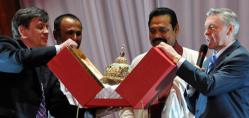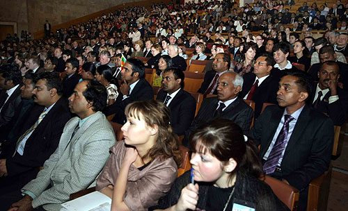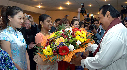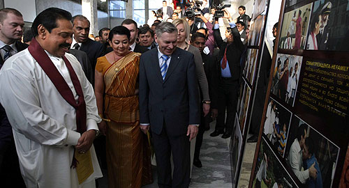 President Rajapaksa is seen here being welcomed at the ceremony by the students of the university and the Vice Chancellor Professor Vladimir M. Philipov. The Sri Lankan President was honoured once again at the cultural show by Prof. Philipov, by presenting a memento, a Russian style gold plated crown, decorated in precious stones. Later the President addressed the gathering and recalled the friendly ties between Sri Lanka and Russia. President Mahinda Rajapaksa and the First Lady also participated in the opening ceremony of the “Rajatha Dekma” photo exhibition which was organised by the President’s official photographer, Mr Sudath Silva in the university premises. Rajatha Dekma displays the photographs of Sudath Silva’s quarter century journey in his profession as an official photographer for four successive presidents of Sri Lanka. President Rajapaksa, who is presently on a tour of Russia, received the Honoris Causa Doctorate from the Peoples’ Friendship University formerly known as Patrice Lumumba University in Moscow on 6th February. He was conferred the Doctorate for his contribution to world peace in defeating terrorism and for his distinguished service to education and development. Among the distinguish guests there were many Sri Lankan students at the function. On his first state visit after being elected to a second term, President Rajapaksa is due to meet with his Russian counterpart Dmitry Medvedev and Prime Minister Vladimir Putin this afternoon. Ministers Rohitha Bogollagama, Anura Priyadarshana Yapa, Susil Premjayantha. Prof. G.L Peiris, Mahindananda Aluthgamage, Mr.Wimal Weerawansa MP, Secretary to the President Mr.Lalith Weeratunga, Sri Lanka Ambassador in Moscow Mr.Udayanga Weerathunga, Director Genaral of the Colombo Hospital Dr.Hector Weerasinghe and the co-ordinator to the President Mr Sajin Vas Gunawardena were present at the occasion. Pix by: Sudath Silva