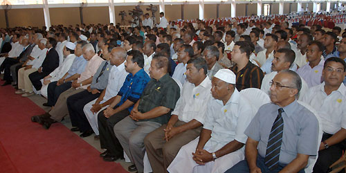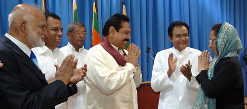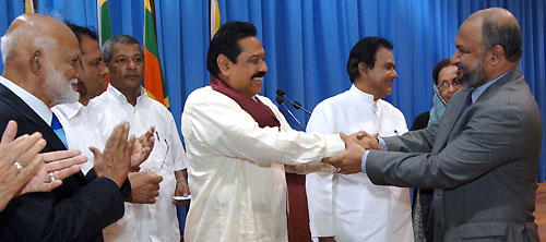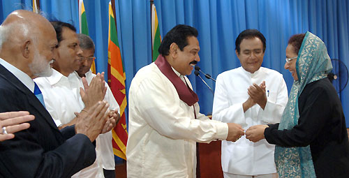 Widow of the founder leader of Sri Lanka Muslim Congress (SLMC) late Mr M.H.M.Ashraff, Mrs Farial Ashraff was the 1st Muslim woman to become a Sri Lanka Cabinet Minister. At the same time former UNP parliamentarian for Samanthuraya electorate Mr A.M.M.Naushad also met President Rajapaksa and received his SLFP membership at Temple Trees. General Secretary of the Sri Lanka Freedom Party, Minister Maithripala Sirisena, Minister D.M.Jayarathne and Minister A.H.M.Fouzi were present. Pix by: Nalin Hewapathirana