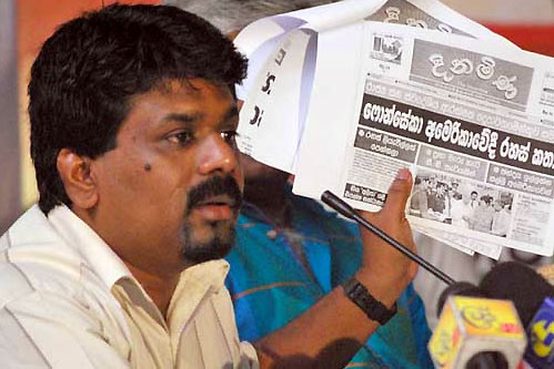 Hitherto, we avoided furnishing details on this taking into account the risks to the livs of those who gave the funds. These funds were received from various individuals and voluntary Organizations for the elections campaign. All factual details will be furnished to Court soon ., Dissanayake asserted. The State media ‘s reprehensible conduct was exposed by Dissanayake with reference to so many misleading articles published by them . All those who were taken into custody for alleged conspiracy in collusion with Gen. Fonseka have been released except six of them. We challenge the Govt. , if possible to adduce evidence to substantiate its claims. When election frauds of the Govt. are being exposed , the State media charges that the General is going to destroy Democracy. Polling cards were strewn all over implying that the govt. has not taken steps to conduct a free and fair election duly. It is nearly a month since Gen. Fonseka was arrested. But , still no charges have been filed. The State media declares that while being in the Security Council he acted as a traitor. But, what the General did when he was there was mapping out strategies to wipe out terrorism.. The Govt. on the contrary says, the General and Lakshman Seneviratne had talks.. We wish to ask, cant Army Commander speak to an Opposition M.P. ? Is that a traitorous action? Are Parliament MPs barred from talking to an Army Officer? Has anybody been taken into custody any day for indulging in such acts.? We would like to ask Minister Dr. G.L. Peiris, and because of the State media news canards, where is the law against the Ministers who have earned in billions and trillions.? The Intelligence unit reported on a Minister who had transactions with the LTTE. Where is the law against such Ministers ? GL is castigating Sarath Fonseka endlessly. . But during the period of the ceasefire in 2002 , GL opposed Fonseka and agreed with the LTTE to remove the high security zone in the North East through Norway intervention. It was General Fonseka who opposed this when he was the Commanding Officer of Jaffna at that time. GL is now avenging what was done to him in the past. It is clear that the General is not guilty of charges as the Govt. has so far failed to indict the General lawfully., Dissanayake pointed out. Courtesy: LankaeNews