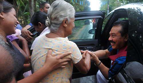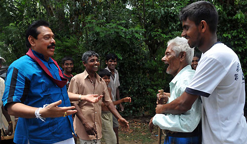 President Mahinda Rajapaksa is seen here having casual chats at many informal stops in towns of Kirama, Katuwana, Walasmulla, Modarawana, Beliatte, Galagama and Ranna in the Hambantota district Southern Province of Sri Lanka. He visited those towns, some are still rural villages after casting his vote at D.A.Rajapaksa Maha Vidyalaya poling station in Medamulana, his home town yesterday afternoon on 8th April 2010.