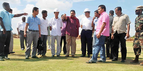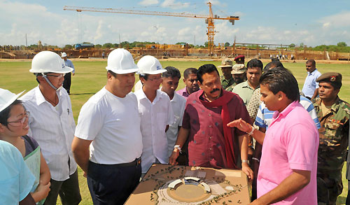 President Mahinda Rajapaksa along with his elder son and the Chairman of the Tharunyata Hetak movement Mr Namal Rajapaksa inspected the construction of the proposed International Cricket Stadium in Sooriyawewa at Hambantota district in the early hours of 09th April.