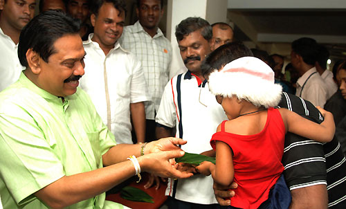 One local family stated that they always visit Medamulana to meet their favourite local hero, ‘Mahinda mahaththaya’ on New Years day. Pictures are seen here President Mahinda Rajapaksa celebrates New Year in keeping with traditions with locals and paying obeisance to his elder brother Minister Chamal Rajapaksa. First Lady Shiranthi Rajapaksa, Mr. Namal Rajapaksa, Mr. Gotabaya Rajapaksa were also present the occasion. Later President Rajapaksa visited People’s Bank local branch at Tangalle to deal “Ganu Denu”with keeping Sinhala Aluth Avurudu tradition. Pix by: Nalin Hewapathirana