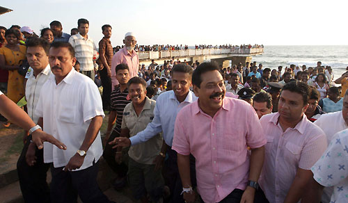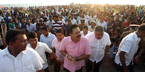 President Mahinda Rajapaksa made a surprise visit to the Galle Face Green to inspect the Galle Face Green Development Project this evening on 15th April. A large crowd was at the Green with the dawn of the New Year and the President visited the location and met many of the visitors.