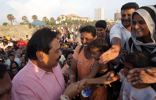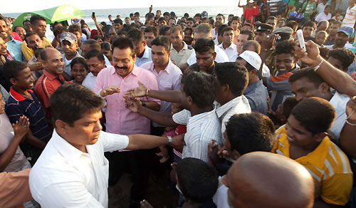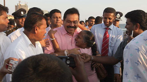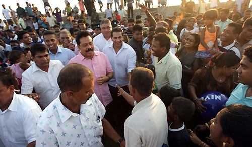 Galle Face Green is a very busy and popular place for people for relaxing and spending leisure time in evenings and week ends. Specially after eliminating terrorism totally it has become over crowded with people of all walks. The President visited the place to check the developments which provide more facilities for people who spend their free time on the Green. It was quite an unusual sight to see that the president, the head of the state, openly walking up to common Sri Lankan people and shaking their hands and giving them hugs. The president mingled with the people and the children including the elderly and spent time talking to them not necessarily about politics but of just everyday talk. People extended a warm welcome to the President. They took turns to talk to the President at this kind of a rare occasion when they see the Head of the State in an unusual place. Through these gestures he showed how he really cares for his countrymen and that how Sri Lanka is finally safe enough for someone of his stature to be able to freely, walk up to and talk to people without a great risk of a terrorist attack. Former Minister Geethanjana Gunawardena, newly elected MP Duminda Silva and the Chairman of the Port Authority Dr.Priyath Bandu Wickrema were also present. Pix by: Sudath Silva