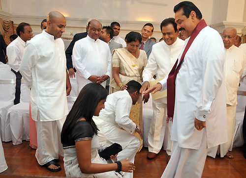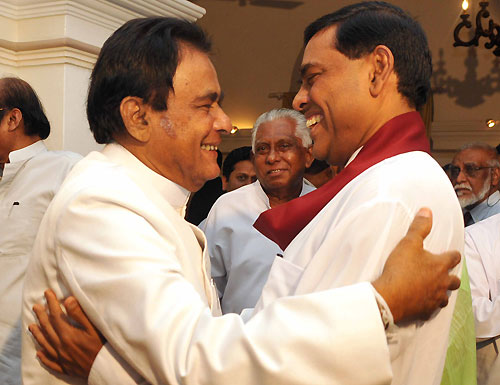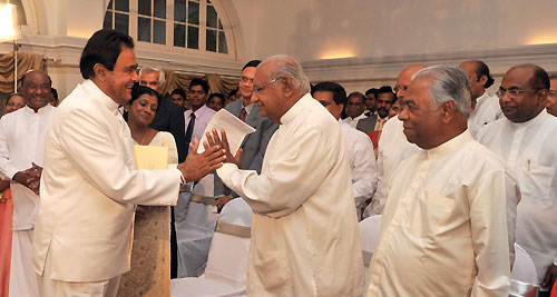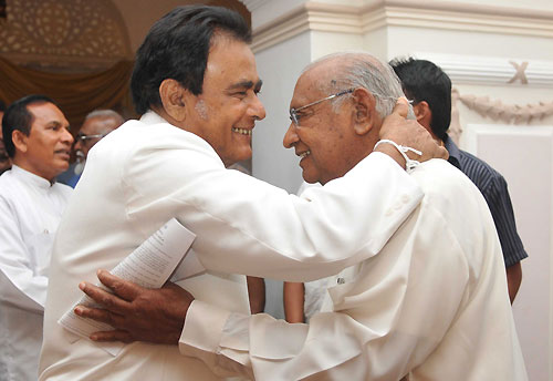 Disanayake Mudiyanselage Jayaratne (79 years) the former parliamentarian from Gampola electorate in the Kandy district was appointed through the National list for the newly elected United Peoples Freedom Alliance (UPFA) government before he was sworn in as the Premier. Mr Jayaratne entered to the parliament in 1970 and is recognized as a very loyal MP to SLFP. He has held many ministerial posts and eagerly waited for the Premiership for a long time. Former Prime Minister Ratnasiri wickramanayake and President Rajapaksa’s younger brother Basil Rajapaksa MP, one of the front runners for the Premiership congratulated the new Prime Minister at the swearing ceremony. Members of the new government and the family members of the Prime Minister Jayaratne participated at the ceremony. Son in law of the Prime Minister, Duminda Dissanayaka MP and former minister also participated with his father Berty Premalal Dissanayake, Chief Minister of the North Central Province. Pix by: Chandana Perera