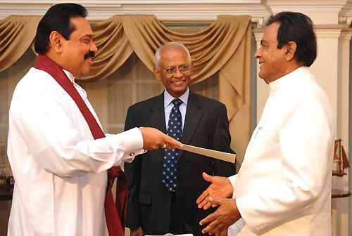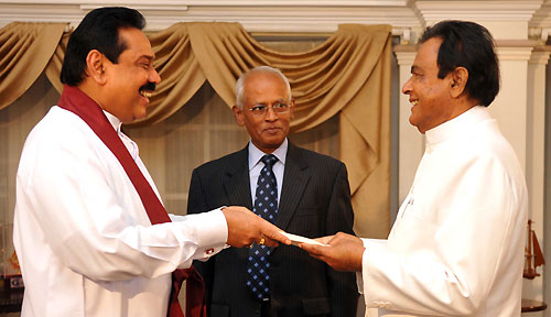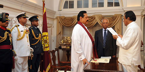 Mr D.M.Jayaratne, senior member of Sri Lanka Freedom Party (SLFP) was sworn in before the President Mahinda Rajapaksa as the 14th Prime Minister of the Democratic Socialist Republic of Sri Lanka at Temple Trees this afternoon on 21 April.