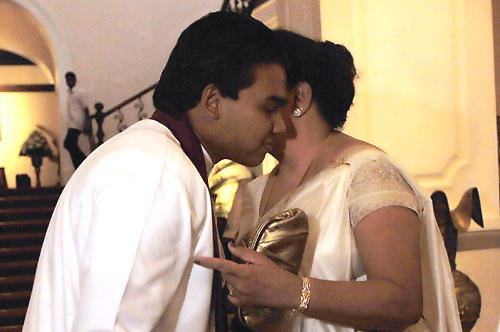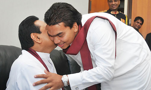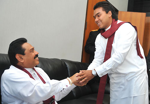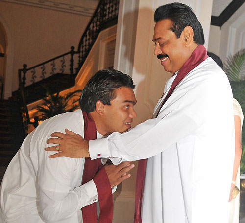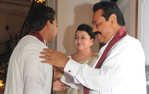 Just before Namal Rajapaksa leaves Temple Trees to take oaths as a MP in the parliament, President Mahinda Rajapaksa felicitated him by offering the ‘Rajapaksa Trade Mark’, the traditional ‘Kurahan Saatakaya- (Maroon Shawl)’ and taught him how to wear it. President Rajapaksa and Mrs Rajapaksa also bestowed their blessings on their son. President Rajapaksa who has decided not to address the inaugural session of the parliament was however seen while following the parliamentary proceedings of the opening ceremony inside a media box near the translators. Meanwhile First lady Shiranthi Rajapaksa and few family members were seen in the VIP gallery watching her son being sworn in as a MP. Pictures are seen here of the affectionate parents, President Mahinda Rajapaksa and First Lady Shiranthi Rajapaksa bestowing blessings on their elder son at Temple Trees and Namal Rajapaksa, Sanath Jayasuriya and Prof. Rajiva Wijesinghe taking oaths as MPs with other members in the parliament. Pix By: Chandana Perera & Nalin Hewapathirana