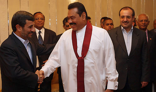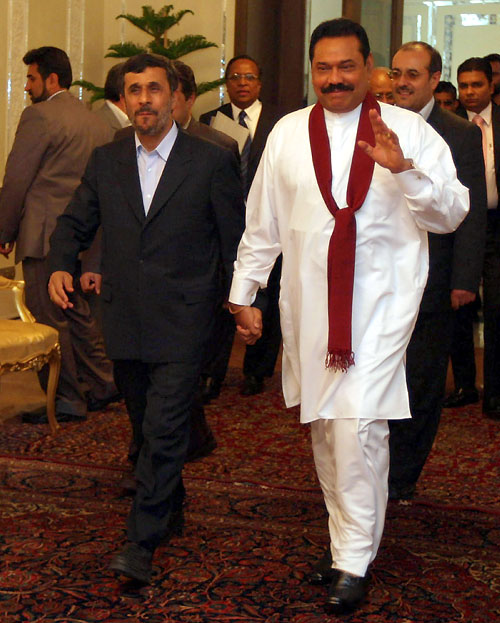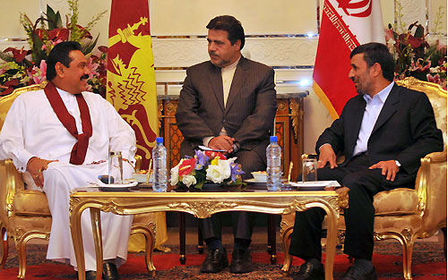 He was warmly welcomed by the President of the Islamic Republic of Iran, Dr Mahmoud Ahmadinejad at President Palace. Both leaders held a discussion to strengthen bilateral relations and agreed to boost mutual cooperation. Iran also pledged to make earnest efforts to ensure progress within the G15 as Sri Lanka assumes the group’s Presidency. President Ahmadinejad also extended his congratulations to the Sri Lankan President for receiving the Chairmanship of the 14th G15 Summit in Teheran. Presently it is chaired by Iranian President Mahmoud Ahamedinejad. The G15 was established 20 years ago from developing countries in Asia, Africa and Latin America to enhance the economic, political and multilateral trade activities among the members and also to provide input for other international groups. Minister of External Affairs Prof G.L.Peiris, Secretary to the President Lalith Weeratunga, Secretary of the Ministry of External Affairs Romesh Jayasinghe, newly elected MP Sajin Vas Gunawardena and Sri Lanka’s Ambassador to Iran M.M.Zuhair were present. Pix By Sudath Silva