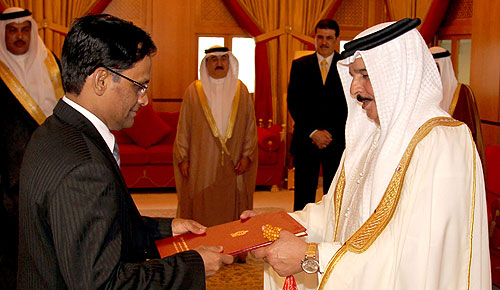 Sri Lanka's Ambassador to the State of Kuwait Sarath Dissanayake, who is concurrently accredited to the Kingdom of Bahrain presented his Letter of Credence to His Majesty Sheikh Hamad Bin Isa Al-Khalifa, the King of the Kingdom of Bahrain on 3rd August at Al - Sakhir Palace in Manama, Bahrain. On arrival at the Al - Sakhir Palace for the presentation ceremony, Ambassador was accorded a ceremonial welcome which included the Guard of Honour, a Salute followed by the playing of the Sri Lankan National Anthem. After the presentation of the Letter of Credence, His Majesty and Ambassador exchanged greetings and compliments. In his opening remarks, Ambassador conveyed the blessings and greetings from the President Mahinda Rajapaksa to His Majesty the King and briefed him on the post-war Sri Lanka's development and opportunities. Ambassador also referred to the excellent relations between the two countries and the new era ushered in Sri Lanka following the defeat of terrorism. Reference was also made to the historic visit of Bahraini Premier to Sri Lanka in July 2009, during which 05 MOUs were signed paving the way for the consolidation of relations and further strengthening of cooperation in a range of sectors. Ambassador expressed his gratitude to the Government of Bahrain for opportunities given for a large number of Sri Lankans to work in Bahrain thus benefiting the host country and their motherland. His Majesty on his part congratulated President Mahinda Rajapaksa and the people of Sri Lanka on the achievement of lasting peace. Furthermore, he noted with appreciation the contribution by Sri Lankans in Bahrain for his country's socio-economic development. His Majesty extended his best wishes to the Government and people of Sri Lanka for a bright and prosperous future. On the 4th August, the Undersecretary of the Foreign Ministry, Mr. Abdulla Abdullatif Abdulla hosted a reception to welcome the newly accredited Ambassadors. In his remarks, Undersecretary congratulated the Ambassadors and spoke on the need to work closely with the envoys for further promotion of relations and assured them of his country's support in the conduct of their duties. Sri Lanka's Ambassador spoke on behalf of the newly accredited Ambassadors and expressed appreciation to the Government and the people of Bahrain for the warm welcome and generous hospitality provided. He expressed the hope that the relations between Bahrain and their respective countries concerned will be further strengthened for mutual benefit during their tenures of office. As part of his schedule in Bahrain, Sri Lanka's Ambassador also met with the Sri Lankan community in Bahrain on 3rd and 5th August respectively, organized by the Sri Lanka's Hony. Consul to Bahrain Mr. Tissa Higgoda. In his remarks, Ambassadors appreciated the Sri Lankans for their contribution for the promotion of Sri Lanka - Bahrain relations and requested them to work hard to contribute for their country's economic development. Bahrain is home to over 15,000 Sri Lankans who are employed in skilled, semi-skilled and other sectors. Sri Lankan Ambassador was assisted in all the arrangements during the visit by Mr. Tissa Higgoda, Sri Lanka's Hony. Consul in Bahrain.