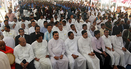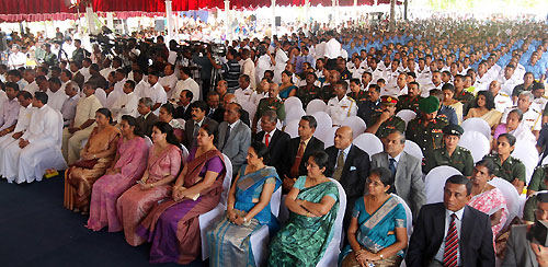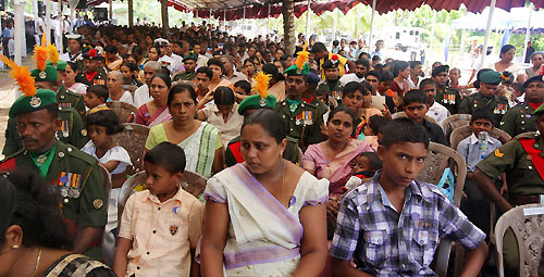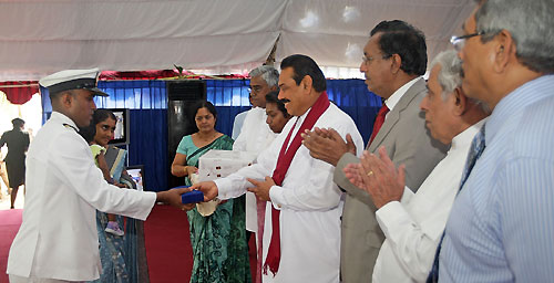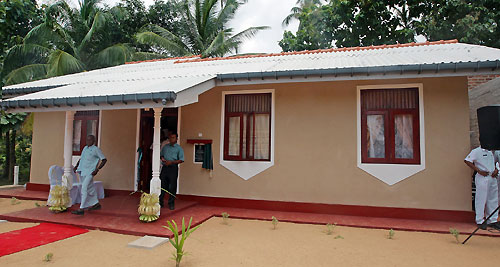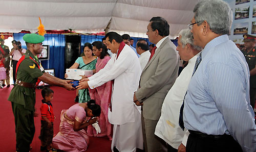 To mark the occasion, President Rajapaksa handed over the first key of those houses to the widow and children of a fallen war hero of Sri Lanka Navy, Officer T.M.R.K Tennakoon who made his utmost sacrifice for defending the motherland while serving in the battle front in 2007. Twenty five (25) houses were completed as the first phase of this Ranaviru housing project in Senerathgama in Kandy on 11 July 2010. President Rajapaksa handed over the keys of all these houses either to war heroes who were rendered disable or to widows and children of the fallen war heroes. North Western province Governor Tissa Balalla, North Western Chief Minister Athula Wijesinghe, Defence Secretary Gotabaya Rajapaksa, Chairperson of the Defence Ministry's Seva Vanitha Unit Mrs Ioma Rajapaksa, Chief of Defence Staff and Air Force Commander, Air Chief Marcel Roshan Gunathilake, Army Commander Lt General Jagath Jayasooriya, Navy Commander Vise Admiral Thisara Samarasinghe were also participated at the event. The ‘Api Wenuwen Api Fund’ is a collaboration between the Ministry of Defence and the Central Bank of Sri Lanka to build 50,000 houses for the serving Three Forces personnel in Sri Lanka. However Ministry of Defence launched this particular housing project to construct 700 housing units island-wide for the war heroes. Third and the fourth phases of this program have already started in Hambantota and Matara districts. Fifth phase will be commenced in the Moneragala district soon. Construction of 12 more Ranaviru houses in Kurunegala district is also in progress. Many Sri Lankans, especially living in abroad have contributed to this Ranaviru housing project. Every cent received for the fund from the public is utilized to construct houses. The fund was only used to buy the materials for the constructions. The labour is provided by the Three Forces. The whole project is conducted under the guidance and close supervision of the Defence Secretary Gotabaya Rajapaksa. Contributions can be made to the Api Wenuwen Api fund to the following Account Numbers. Bank of Ceylon Ac No: 704000, Sampath Bank Ac No. 704000 & Ac No: 092960000600 and Peoples Bank Ac No: 204-1-001-7-0000323. Pix by: Sudath Silva