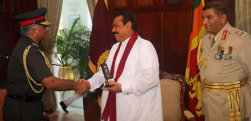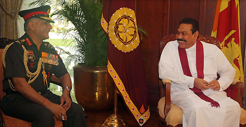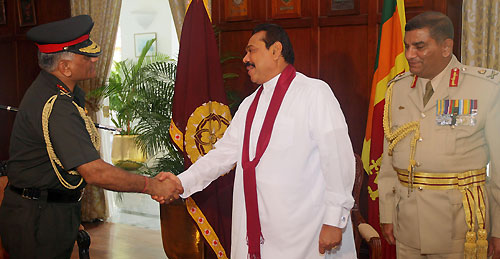 The visiting Indian Army Chief, General Vijay Kumar Singh paid a courtesy call on President Mahinda Rajapaksa at Temple Trees this morning on 06th September. President Rajapaksa and General Singh discussed issues related to military and security affairs that related to both countries. Army Chief explained that the intention of his visit is to strengthen the military ties between the two neighbouring countries.
