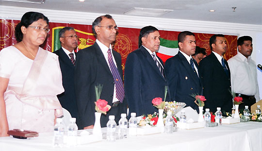A 03-day workshop jointly organized by Sri Lanka Social Security Board ( SLSSB ) and the Sri Lankan Manpower Welfare Association ( SLMWA ) under the patronage of the Sri Lankan Embassy was held from 7 - 11 October at Mirage Hotel in Kuwait aimed at creating awareness on "Surakuma", a newly introduced pension and social security scheme and its benefits to the migrant workers. The scheme, the first of its kind launched overseas, was introduced under the concept "A Pension for All" in the "Mahinda Chinthana Forward Vision" policy document presented by President Mahinda Rajapaksa. It is estimated that over 380,000 migrant workers thus far have become members of the scheme making them eligible for a monthly pension, social security benefits, compensation payments etc. Mr. Dammika Padukka, DGM (Operations ) accompanied by Mr. Indika Jahasinghe, Manager ( Sales Promotion ) represented the SLSSB at the programme organized by Mr. Nelson Christopher, President and members of the SLMWA under the distinguished presence of Sri Lankan Embassy staff represented by Mr. D.M.P.B. Dissanayake, Charge d' Affaires and senior diplomats of the Sri Lankan Embassy. Mr. Ifthikar Ahamed, SLSSB Middle East Coordinator and Mr. Mohamed Noordeen, SLSSB Agent in Kuwait facilitated arrangements in this regard. A large gathering of Sri Lankans who turned up for the event expressed their interest to join the scheme during the launch. The "Neth TV" channel, the sole media sponsor of the event was represented by Mr. Mahesh Bandara ( CEO ) and Mr. Kassapa Diyabedanage ( Head of Operations & Devpt.) On behalf of the Sri Lankan Ambassador, Charge d' Affaires, Mr. D.M.P.B. Dissanayake delivered a speech in which he welcomed the new pension scheme launched in Kuwait and appreciated the efforts and initiatives taken by H.E. the President and the SLSSB officials for having chosen Kuwait as the first destination to introduce the "Surakuma Scheme". He also thanked SLMWA for hosting the event and for the generous hospitality extended. He extended Embassy's fullest support toward promoting this scheme among the Sri Lankan diaspora. In his speech Mr. Dammika Padukka, DGM conveyed his appreciation to the SLMWA and the Embassy for their support toward promoting this novel pension scheme. Elaborating further he appealed to those in the audience to obtain "Surakuma" membership and avail its benefits. Mr. Jahasinghe, Manager also spoke and emphasized their commitment toward ensuring security of migrant workers. Several members in the audience also spoke in support of this worthy endeavour. The scheme which is specially designed for the migrant workers has been welcomed by the Sri Lankan diaspora in Kuwait as a timely initiative toward safeguarding their interest and future wellbeing.