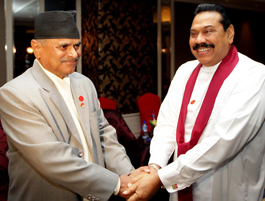 External Affairs Minister Prof.G.L.Peiris, Housing Minister Wimal Weerawansa, Parliamentarian Sajin Vas Gunawardane, President's Secretary Lalith Weeratunga, Ambassador for China Karunathilake Amunugama also participated at the meeting. President Mahinda Rajapaksa met his Nepalese counterpart Ram Baran Yadav, this morning (31 October) in Shanghai China. Both leaders are currently in China to participate the closing ceremony of the six months long Shanghai EXPO 2010 International Trade Exhibition organized by the Government of China. Numbers of Head of States were invited as special guests of the ceremony. The two leaders discussed many matters related to both countries including political, trade and investment, education and tourism. President Rajapaksa also promised to continue the support given to Lumbini Development Project, sacred Buddhist site in Nepal. External Affairs Minister Prof G.L.Peiris and Secretary to the President,Lalith Weeratunga participated the occasion. Sri Lankan President also scheduled to meet Wen Jiabao, Prime Minister of China this afternoon before the conclusion of his two days official visit to China. Pix by: Sudath Silva