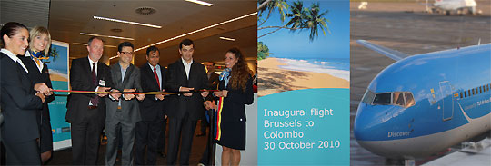 Sri Lanka’s Ambassador to Belgium, Luxembourg and the EU Ravinatha Aryasinha has said, “Sri Lanka is today one of the safest destinations in the world a tourist can expect to fly to”. The Ambassador made this observation when he addressed passengers traveling to Sri Lanka on the maiden Brussels-Colombo direct flight, at a departure ceremony held on Saturday (30 October 2010) at the Brussels International Airport. The Ambassador who noted that “tourist arrivals to Sri Lanka from Belgium had increased by 82.8% up to September this year, said this compared well with the 50% increase recorded from Europe, and the 44% recorded from around the world, in the same period". Commending Jetairfly and Thomas Cook for being one of the first European collaborations to re-commence direct flights to Sri Lanka, he said it will be a huge boost to the marketing of the destination not only in Belgium, but also in the entire BENELUX region (Belgium, The Netherlands and Luxembourg) and would result in an exponential growth in tourists to Sri Lanka from these countries. He urged the visitors to Sri Lanka, to on their return, share their experience with others, so that more will be encouraged to make the journey, which will strengthen the people-to-people bonds between Europe and Sri Lanka. The Ambassador later joined Mr. Jos Stroobants, Director/ Brussels Airport, Mr. Elie Bruyninckx Chairman Jetairfly and Mr. Marc Van de Wal, Director,Thomas Cook Belgium, in cutting a ribbon at the boarding gate to formally inaugurate the flight.