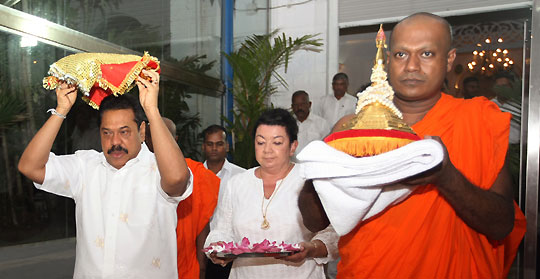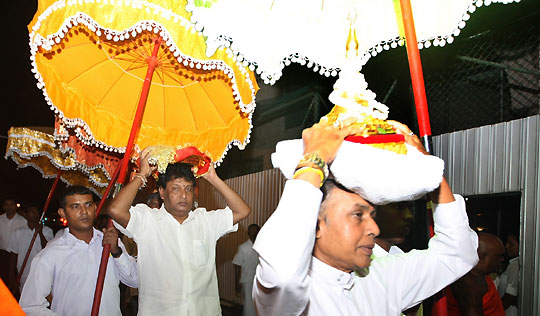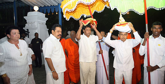 President Mahinda Rajapaksa and Mrs Shiranthi Rajapaksa participated the annual Katina ceremony organized by the Gangaramaya Temple, Hunupitiya, Colombo in the early hours on 08 November. The Katina Perahera (procession) was started from the Temple Trees with participation of the President, family members, Temple Trees staff and large number of devotees of the temple. The Katina Robe, holy relics and other sacred Buddhist objects with flower poles and flags were paraded to the temple.