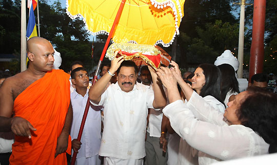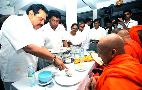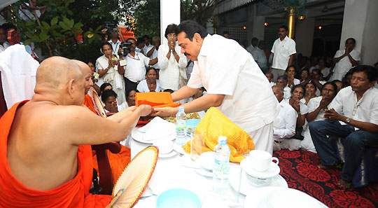The Katina dhana along with the Katina Robe was offered to Maha Sanga with great respect and devotion by President Rajapaksa and the members of the dayaka sabhawa. Maha sanga headed by Mahanayaka of the Asgiriya Chapter Ven. Dr Udugama Sri Buddharakkitha Nayaka thero, Chief Incumbent of the temple Ven. Galaboda Gnanissara Nayaka thero and Ven. Dr Kirinde Assaji thero conducted the religious sermons. Chairman of the Gamgaramaya Temple dayaka sabhawa, Ranjith Wijewardhena also participated at the ceremony. Pix By: Chandana Perera