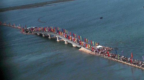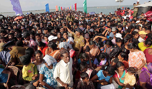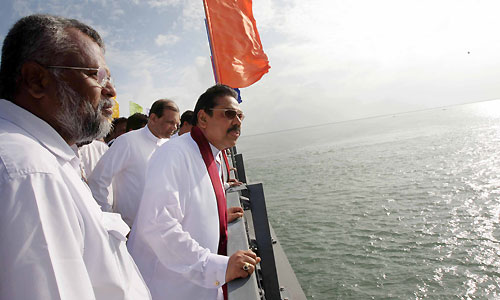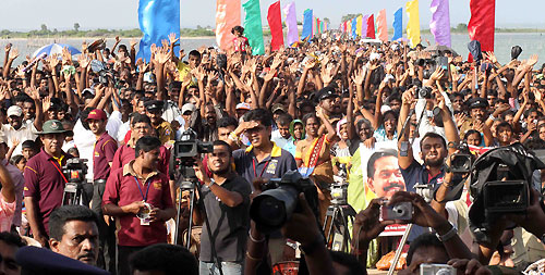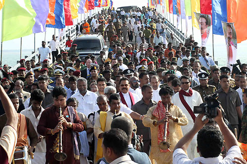 The Tamil Tiger terrorists who controlled the area blasted the bridge before their defeat decades ago. It caused huge disruption to the people in north of Sri Lanka. Before its destruction, thousands of people used the bridge daily. The government started the reconstruction of the bridge soon after the complete defeat of brutal terrorism in May 2009. Sangupiddy Bridge was constructed under the “Uthuru Wasanthaya- Wadakkil Wasantham” (Northern Development Project) for the Northern Province at a cost of 1.3 billion rupees. The bridge is 288 meters long with two lanes. It took eight months to construct and the British government provided a soft loan. With the opening of the new bridge there will be two land access routes to the Jaffna Peninsula and after decades it is a dream comes true for thousands of people who used the bridge daily. The Sangupiddy Bridge that connects the A-32 road from Mannar to Jaffna across the lagoon is the shortest land route to Jaffna from Colombo. The distance of travelling to Jaffna will be cut by 120 kilo meters than the way through the main A-9 Jaffna-Kandy Highway. It will also be possible to cut the traveling time by three hours. The bridge is also expected to assist the reconstruction and future development of areas in the North. In parallel to the construction of the Bridge, the Pooneryn-Jaffna and Puttalam-Mannar roads are also being reconstructed under the direct supervision of President Mahinda Rajapaksa. Pictures are seen here the aerial photo of the bridge and President Rajapaksa interact with the happy crowds who were there to witness the opening ceremony of their dream bridge. Ministers Basil Rajapaksa, Douglas Devananda, Governor of the North Major General Jagath Chandrasiri, Army Commander Lieutenant General Jagath Jayasooriya, newly appointed Navy Commander Vice Admiral Somathilake Dissanayake, Inspector General of Police Dr. Mahinda Balasooriya, and senior government officials also were present. For more informationSri Lanka: Northern Road Connectivity Project Pix by: Sudath Silva