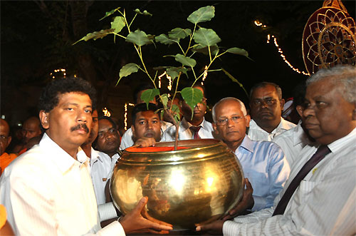 A sapling of the Jaya Sri Maha Bodhi in Anuradhapura was brought to Temple Trees which is ready to be send to India on Monday 14 February. The sapling to be taken to India for planting at Buddhagaya to mark the 2600th Sambuddha Jayanthi celebrations was removed from the Uda Maluwa of the Jaya Sri Maha Bodhi recently in a colourful ceremony.