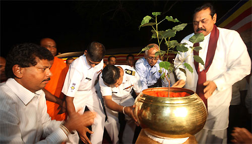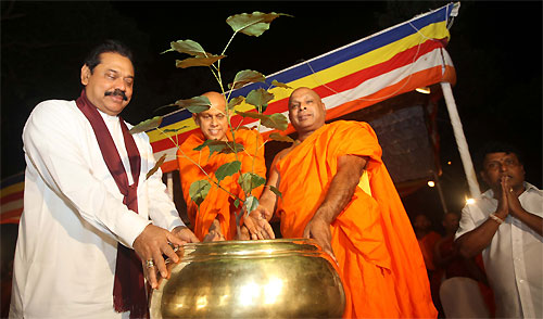 This special religious ceremony was attended by the Maha Sangha led by Atamasthanadhipati and Chief Sanghanayaka Ven Pallegama Siriniwasa Nayaka Thera and a large number of devotees including North Central Province Governor Karunaratne Divulgane, Chief Minister Berty Premalal Dissanayake and Parliamentarians and Provincial Councilors. The sapling was placed in a gilded casket by Chief Minister Dissanayake. After a pirikara pooja the Bo-sapling was taken in a special motorcade to the Anuradhapura city from where it was airlifted to Dambakolapatuna in Jaffna peninsula escorted by Dr Palitha Mahanthegama. When the sapling reached Colombo via Vavuniya, Dambulla, Kandy, Pelmadulla and Matara, President Rajapaksa worshiped at the sapling in the religious ceremony conducted by Maha Sangha at Temple Trees. Later on behalf of the Government of Sri Lanka, President Mahinda Rajapaksa officially handed over the Sri Maha Bodhi Sapling to the Venerable Akuratiye Nanda Thera and Chief Sanghanayake of Bharath (India) Venerable Dr.Dodamgoda Rewatha Thera. Prime Minister D.M Jayarathna, Ministers, Parliamentarians, Secretary to the President Lalith Weeratunga, President’s Chief of Staff Gamini Senarath, officials of the Ministry of Buddhist Affairs and Naval personnel were also present Pix by: Sudath Silva