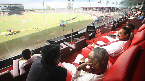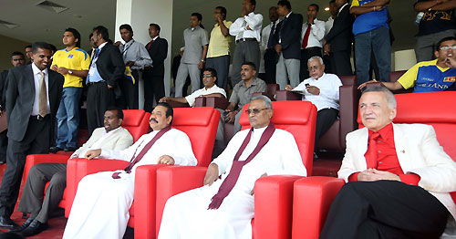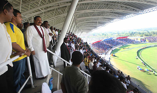 However, while the island nation eagerly waited to witness the inaugural match of the newly built stadium in the deep south of Sri Lanka, Mahinda Rajapaksa International Cricket Stadium in Sooriyawewa, Hambantota was declared open today on 20 February under the auspices of the Speaker Chamal Rajapaksa to host the Sri Lanka vs. Group A minnows Canada match. The inaugural match of the stadium is not only the first match of the Group A but also be Sri Lanka’s first match in the 2011 ICC World Cup. Later in the day President Mahinda Rajapaksa also visited the stadium to watch the cricket match being played between the Sri Lankan and Canadian teams. Speaker Chamal Rajapaksa, Minister of Sports Mahindananda Aluthgamage, Namal Rajapaksa MP, Chief of President’s Staff Gamini Senarath and High Commissioner of Canada Bruce Levy were also present at the occasion to witness the historic match. This is the largest ever cricket ground built in Sri Lanka to date measuring 200 meters by 200 meters. It has 32,000 seating capacity and equipped with the state-of-the-art facilities such as score boards, a seven storey splendid pavilion with comfortable seats, parking space, a modern sophisticated lighting system for day and night matches and everything expects of an International venue. Throughout the day, Hambantota was blessed with a bright sun shine that added glamour to the picturesque newly built stadium as well as to the inaugural match and also added momentum to the district. Today’s match was a complete sell-out and packed to its full capacity. With huge ‘Let the celebrations begin’ and ‘Welcome to Hambantota’ banners were in place along the roads to welcome the fans to Hambantota where never such a game was played of this nature. Pix by: Chandana Perera