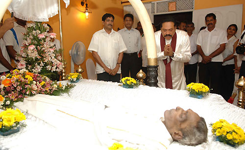 Veteran photographer Mr. Gunasiri Silva whose photographs turned up in news papers, magazines and even national media outlets for many decades has passed away in the early hours on Monday 07 March after a brief illness at the age of 76. Mr. Gunasiri Silva began his career with the "Eththa- (Truth)" newspaper and he also served as a provincial photographer for the Lankadeepa newspaper. During this time as a freelance photographer Gunasiri Silva was the personal photographer to prominent political leaders including Dr. N.M. Perera, Dr. Colvin R de Silva, Bernard Soysa and Ranasinghe Premadasa. Mr Silva started to serve late President Ranasinghe Premadasa while he was a local councilor at Colombo Municipal Council in the early days of his political career. Later he joined the Government Media Unit and served as the personal photographer to the late President Premadasa during his tenure as the Prime Minister. Mr. Silva was the still photographer in films such as Sakuntala, Hariyata Hari, Singapore Charlie and Kokila. In addition, he had photographic studios named 'Gunasiri Photo' at Rajagiriya, Galle Face and Pettah. When Mr Silva started his career as a photographer in 1960’s, technology was not developed, old fashion still cameras were used and they were not sophisticated. Not many professional cameramen were around as well as quality cameras. During that time no one ever dreamt of modern day digital technology. However Mr Silva provided a valuable service to Rajagiriya, Welikada, Sri Jayawardenapura- Kotte and Borella area with his professional camera. He is well known to my parents and has taken their photos as a young couple. When President R.Premadasa was the Prime Minister and the Minister of Housing Construction and Development, Mr Gunasiri Silva was regular visitor to ‘Gam Udava’ and other development programmes as a cameraman. Later his sons including Sudath Silva who has served four Presidents of Sri Lanka continuously from R. Premadasa, D.B.Wijetunga, Chandrika Kumaratunga to the present President Mahinda Rajapaksa as their official photographer, started to follow their father’s footsteps joining Gam Udava and projects carried out by President Premadasa. As young cameramen, they also served Mrs Hema Premadasa too. When Colombo city was developed specially the Kehelwatta area, the then Prime Minister offered a place for Gunasiri Silva to start up a new studio in the newly build housing and shopping complex at the Sangharaja Mawatha round-about near A.E.Gunasinghe statue at Pita Kotuwa. I was invited for the opening ceremony of Gunasiri Studio with my brother to witness it. As a young boy I took the138 bus after school from Royal College to Pettah and joined the crowd at the opening ceremony in my school uniforms. Prime Minister R.Premadasa was the Chief Guest. He declared open the studio by taking a photo by himself. It was captured by Mr Silva’s camera and that memorable occasion is still hanging on the walls at the entrance of Gunasiri Photo at Pettah. Since then Cameramen from Gunasiri Photo were a common sight at my house when ever we had a function including my wedding in late 90's. President Mahinda Rajapaksa also paid his last respects to veteran photographer late Mr. Gunasiri Silva, father of Sudath Silva, Media Director and the official photographer of President Mahinda Rajapaksa on Monday 07 March. Pictures are seen here, President Rajapaksa exchanged pleasantries with the family members after paying tribute to the deceased. Secretary to the Media Ministry W. D. Ganegala, Chief of President's Staff, Gamini Senerath were also present. Shocked family, friends and neighbors told of Mr Silva’s passion for life, photography and cameras. Mr Gunasiri Silva is survived by his wife Karunawathi Silva, sons, Sudath, Sarath, Vijith (singer) and daughters, Daya Hemalatha, Ranjani Hemalatha (Sri Lanka High Commission-London) and Chithrani Hemalatha. The remains will be kept at No. 21B, Anagarika Dharmapala Mawatha, Hokandara Road, Thalawathugoda. The funeral will take place at the Hokandara Public Cemetery on Wednesday 09th March (today) at 4.00 pm. May He Attain Nibbana! Pix by: Chandana Perera
