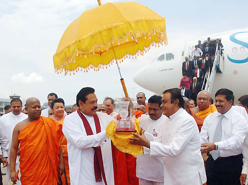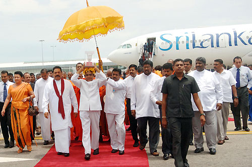 President Rajapaksa returns with sacred Hair Relics of Lord Buddha