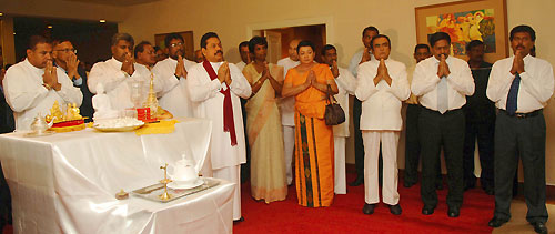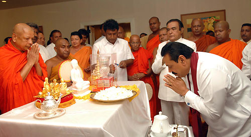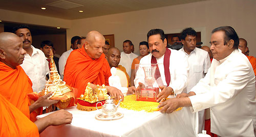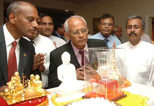 Responding to a request made by the Sri Lankan President, Bangladesh Prime Minister Sheikh Hasina agreed to release the Lord Buddha’s hair relics deposited at Chittagong to be taken to Sri Lanka for a public exposition to mark the 2600th Sri Sambuddhathva Jayanthi commemoration. President Rajapaksa handed over the sacred relics to Prime Minister D.M.Jayawardena at the Airport. A special religious programme was conducted by Maha sangha headed by the Chief Incumbent of the Gangaramaya Temple Venerable Galaboda Gnanissara Nayaka thero at the Airport. Under the Ministry of Religious Affairs, the Sri Lankan government has implemented a special programme to commemorate the 2600th anniversary of the Buddha's Enlightenment during Wesak festival that falls on May 17 this year. Public exposition of the Buddha's hair relic will be one of such events organized by the Ministry of Religious Affairs. Pictures are seen here President Mahinda Rajapaksa is arriving with sacred hair relic of Lord Buddha at Katunayake Ariport after a successful state visit to Bangladesh, Prime Minister bearing the relics alongside the President on arrival and venerable Maha sangha conduct rituals. First lady Shiranthi Rajapaksa, Cabinet Ministers, MPs, Secretary to the President Lalith Weeratunga and a large number of officials were present at the Airport. Pix By: Nalin Hewapathirana