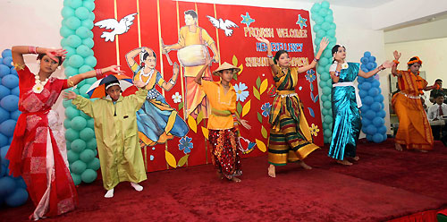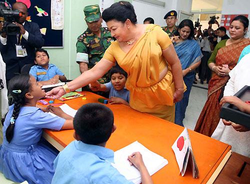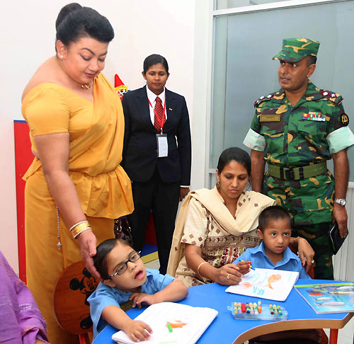 Sri Lankan First Lady Shiranthi Rajapaksa visited 'Proyash' a school for handicapped children in the Cantonment area in the Dhaka city during her visit to Bangladesh early in the week. The First Lady visited different classrooms and academic programmes of the institute, an army-backed institute for children with special needs which has special facilities for autism victims. Inmates of the Proyash Handicapped Children's Institute warmly welcomed their special guest and staged a colourful performance. Children also took part in different sport events during the programmme. The First Lady interacted with the children of the institute and enjoyed a performance by them. Begum Syeda Sharifa Mubin, patron of the institution, and Brigadier-General Siddiqur Rahman Sarker, Chairman of the institution’s managing committee, were among others present at the programme. Pictures are seen here Mrs Shiranthi Rajapaksa, inmates of the Proyash Handicapped Children’s Institute, members of the management committee and guests pose for a group photograph and First Lady talking to children. Saima Wazed Hossain, daughter of Bangladesh Prime Minister Sheikh Hasina is an advisor, regular visitor and a leading supporter of this institute. She is an autism and clinical psychology specialist and a renowned campaigner in support of autistic children. Saima Wazed is also Bangladesh country representative of "Autism Speaks," member of National Association of School of Psychologist-USA. She was in the forefront with the help of Education Ministry of introducing special rules and regulations particularly in examinations for children with autism and other mental and physical challenges in Bangladesh. Pix By:Chandana Perera