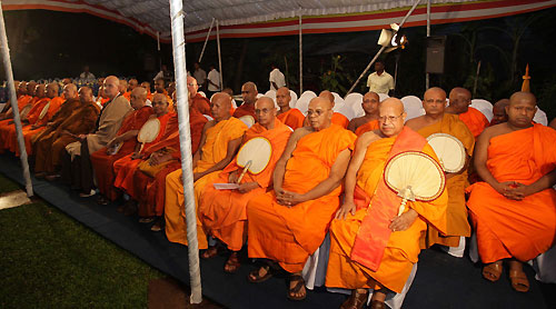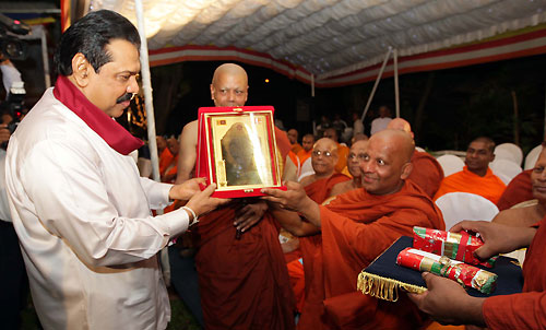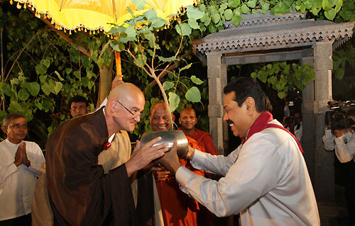 Later Sri Lanka President Mahinda Rajapaksa officially presented the Bo sapling to the President of the French National Buddhist Organization Ven. Oliver Jane at Temple Trees on 28 April. Head of the French National Buddhist Organization said the sapling is to be planted in the organization premises in Paris. Chief Sangha Nayaka of France and the President of the Paris International Buddhist Center Ven. Parawahera Chandarathana Nayaka Thera and a large number of Maha Sangha and devotees also participated in the ceremony. The Sacred Jaya Siri Maha Bodhi in Anuradhapura is reckoned as the oldest surviving historical tree in the world. It was brought to Sri Lanka by the Theri Sangamitta, daughter of the Great Emperor of India, Asoka and the sister of Arahat Mahinda Maha Thera and was planted in the Mahamewna Park in Anuradhapura in 249 BC by King Devanampiyatissa. It is said to be the southern branch of the Jaya Siri Maha Bodhi at Buddha Gaya in India under which Lord Buddha attained Enlightenment. The Mahavamsa or the Great Chronicle of the Sinhalese provides an elaborate account of the establishment of the Jaya Siri Maha Bodhi in the island. Bodhi means wisdom that understands the four Noble Truths. Thus the tree which assisted Lord Buddha to achieve wisdom or enlightenment is called Bodhi. Source: Srimahabodhi.org Pix by: Sudath Silva