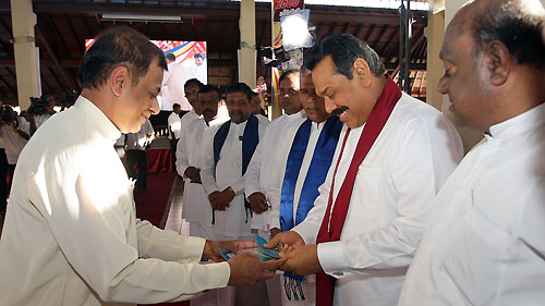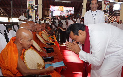 President Rajapaksa also unveiled the 2600th Sambuddhathwa Jayanthi commemoration monument constructed at the roundabout opposite the Jayanthi Viharaya in the middle of the Anuradhapura town. A road named Sambuddhathwa Jayanthi Mawatha also declared opened by the President to mark this great, sacred national and Buddhist event. The Sri Sambuddhathwa Song composed to mark the event was rendered on this ceremony. It was followed by the issue of four postage stamps to commemorate the Sambuddhathwa Jayanthi. These stamps depict Lumbini, Buddhagaya, Jethavana and Kusinara, four important places of religious worship in Lord Buddha’s life. Officials of the Sri Lanka Postal Department presented four five rupee denomination stamps and first day covers to the President. The President in return offered these stamps to the Maha Sangha. The first copy of the Vesak edition of the “Budusarana” newspaper was also presented to the President. A CD containing songs composed by the Chief Incumbent of the Ruwanweli Seya Vihara Ven. Pallegama Hemarathana Thera to mark the Sambuddhathwa Jayanthi was handed over to the President. Venerable Maha Sangha chanted seth pirith to invoke blessings on the President, the Government and the Nation. Members of the Maha Sangha of the three Chapters including Mahanayaka, Ministers, parliamentarians, many politicians, officials, 2600 Dhamma school children and large number of devotees were present at this historic occasion.