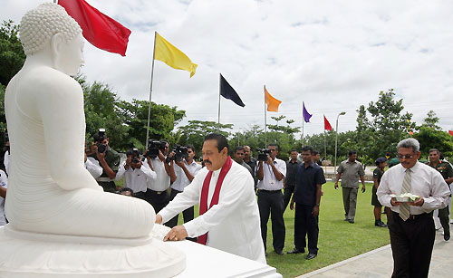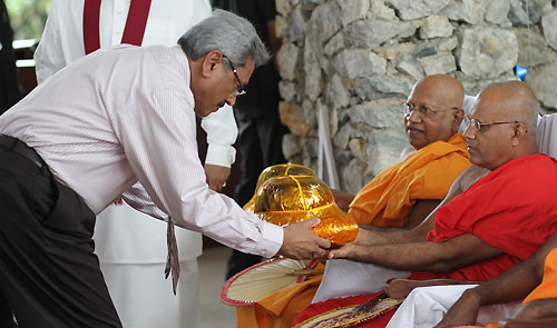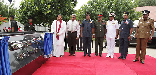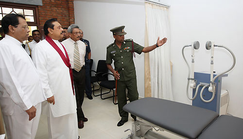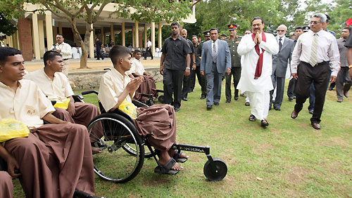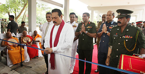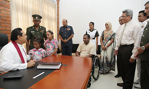 Mihindu Seth Medura was built under the guidance of the Ministry of Defence according to a concept of Defence Secretary Gotabaya Rajapaksa. It is established with the objective of uplifting the health and mental status of disabled war heroes who had been rendered disabled in the humanitarian operations. The Centre will be used by permanently disabled soldiers who are unable to support themselves to spend their rest of the life leisurely or as a holiday resort. They will be cared for and will receive mental and physical support. Mihindu Seth Medura comprises of 50 rooms and is equipped with facilities such as Specialist Medical Services and Emergency Treatment. After the opening ceremony President Rajapaksa joined in with inspecting the facilities of the premises including the exercise units, bedrooms, kitchen and the toilets constructed for the use of war heroes. President Rajapaksa also enrolled the first disabled war hero Major M.S. Ibrahim to the new centre and placed his signature on the memorial book. After the registration the President had a cordial discussion with the family members of the first inmate. He also spent time with disabled war heroes and had friendly conversations with them and their family members. Members of the Maha Sangha including the Ven. Prof. Bellanwila Wimalarathana Thera, senior Minister of Urban Development, A.H.M. Fousie, Minister of Health Maithreepala Sirisena, many Parliamentarians, Defence Secretary Gotabaya Rajapaksa, Head of the Defense Staff, Commanders of the Armed Forces, the Inspector General Police, Senior Security Officers, large number of disable soldiers and their family members were present on the occasion. Pictures are seen here commemoration plaque of “Mihindu Seth Madura” being unveiled, offering of flowers at the Buddha Statue and cutting the ribbon by the President and the rest of the inauguration ceremony. Pix By: Sudath Silva