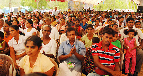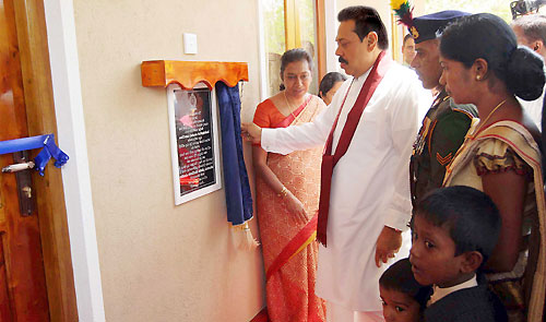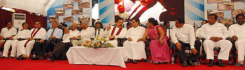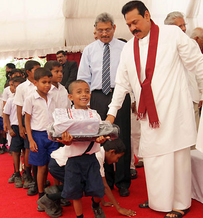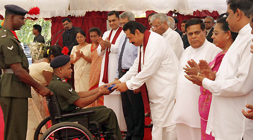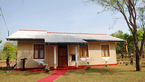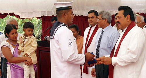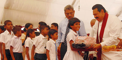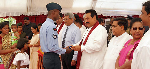 The main ceremony was held at the Ethiliwewa Junior School in Thelulla, Moneragala and the President handed over keys of 31 houses to the recipients at the ceremony. Ministers Sumedha Jayasena, Nimal Siripala de Silva, Jagath Pushpakumara, Lakshman Senevirathne, Vijith Vijithamuni de Soyza, Secretary to the President Lalith Weerathunge, Defence Secretary Gotabaya Rajapaksa, Chief Minister of the Uva Province Shashendra Rajapaksa, Commanders of the tri forces, DIG of Police and family members of the war veterans participated in the ceremony. Pictures seen here are the presentation of the ownership of the house by President Rajapaksa to disabled corporal J.K.Vipula Kumara and presents school equipment kits for 106 children of war heroes’ families. The President also declared open the new house constructed for Army Corporal G.K.Vipula Kumara. The "Api Wenuwen Api" housing project launched by the Ministry of Defence plans to construct 700 housing units island-wide for the war veterans. The fund has constructed these houses for the families of fallen and missing war heroes and disabled and in service soldiers. It is notable that, many Sri Lankans living in abroad, showing their gesture on security forces, have contributed to the "Api Wenuwen Api" housing fund at the request of President Mahinda Rajapaksa and Defence Secretary Gotabaya Rajapaksa. Pix by: Sudath Silva