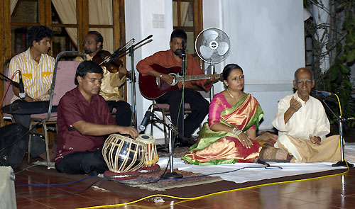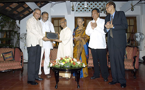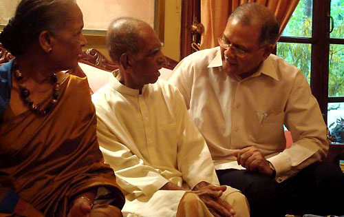 The felicitation ceremony was organized by Ashok K Kantha, High Commissioner for India at India House in Colombo-03 on Monday, 27 June 2011. The living legend of Sri Lankan music, maestro Amaradeva who has also been conferred the ‘Padma Shri’ title by India on India’s Republic Day in 2002. He is the only Sri Lankan citizen to have been awarded such a prestigious award by the Government of India. In 2001, maestro Amaradeva has been conferred with Magsaysay award by the Philippines based foundation for his contribution to the fine arts. The celebrated singer had learnt classical music from an Indian violinist, Pandit V.G. Jog and later from Sri Lankan musical legend Dr Ratnajaikar of the Bhatkhande Institute in Lucknow, India. Pandit Amaradeva is a singer, violinist, conductor and composer who has made a mark in both classical and contemporary styles, acquired the knowledge of Indian music during his stay in India. He was classified as a grade one vocalist in India. Pandit Amaradeva drew inspiration from classical Indian ragas as well as Sri Lanka's own rich traditions of folk music and went on to create music that is quintessentially Sri Lankan. He is also well known for blending Sri Lankan folk music with Indian ragas. The event organized to felicitate maestro Amaradeva at India House was attended by Dr. Sarath Amunugama, Senior Minister for International Monetary Cooperation, Prof. G.L Peiris, Minister of External Affairs, Vasudeva Nanayakkara, Minister of National Languages and Social Integration and Secretary to the President, Lalith Weeratunga. All the speakers at the event paid glowing tributes to Pandit Amaradeva. The event also brought together a number of Pandit Amaradeva's colleagues and luminaries from Sri Lanka’s public and cultural life. Pandit Amaradeva's citation for the award noted that he was being honoured in recognition of his unique role as the voice of Sri Lanka’s musical soul. In his remarks, Ashok K Kantha, High Commissioner for India said that it is important to keep this bigger picture of India- Sri Lanka relations in mind and not get distracted by odd discordant notes on any particular day. He called Pandit Amaradeva an embodiment of the finest traditions of symbiotic exchange that has characterized cultural interface between India and Sri Lanka over the centuries. He said that the silent but enormously powerful give and take between India and Sri Lanka over countless centuries in the fields of dance, music, literature and other art forms had been mutually enriching and provided the civilizational bedrock to our relationship. Pandit Amaradeva was an embodiment of the finest traditions of the cultural interface between the two countries, the High Commissioner further added. Pandit Amaradeva was presented a felicitation plaque by the High Commissioner. Mrs. Sharmila Kantha honoured Pandit Amaradeva and Mrs. Wimla Amaradeva by draping them with rich shawls. The evening concluded with mesmerizing performances of music by Pandit Amaradeva and his daughter, Subhani Amaradeva. Pictured here are Pandit Amaradeva with Indian High Commissioner and government ministers during the event. Source: High Commission of India- Colombo