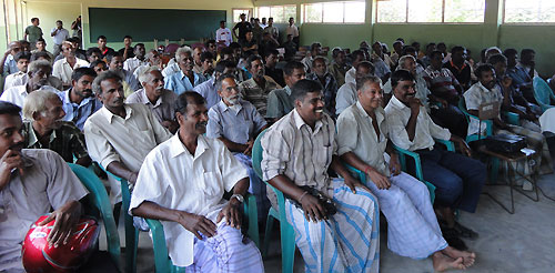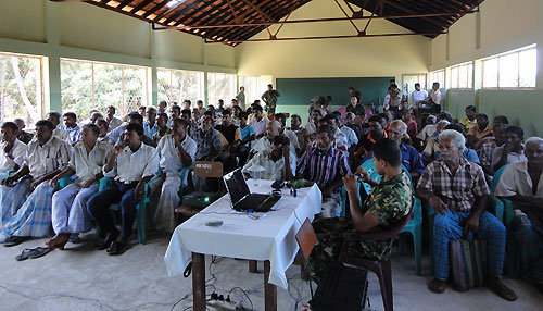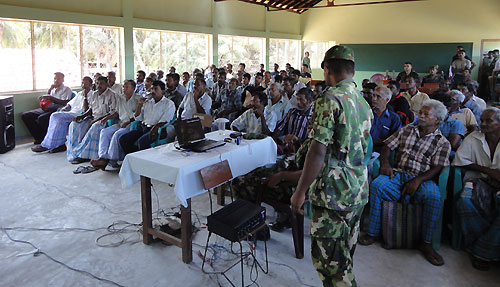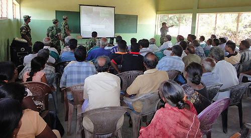 The Government of Sri Lanka completed the resettling of all internally displaced people (IDPs) after demining the lands earlier used by Tamil Tiger terrorists in Jaffna Peninsula. On successful completion of early resettlement, Security Forces Headquarters - Jaffna has planned to launch a Mine Risk Education and Mine Awareness programmes in each and every village for all the newly resettled families to avert any unforeseen instances of mine-related incidents. Therefore Point Pedro based 521 Brigade of Security Forces Headquarters-Jaffna launched this worthy project recently for the civilians in Nagarkovil village to educate them on unexploded ordnance (UXO), land mines and booby traps using computer presentations. Almost all villagers participated in this workshop conducted by the officers of 10th Sri Lanka Army Engineers.
