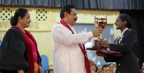 Addressing the prize giving ceremony, President Rajapaksa said that the future of the country belongs to the younger generation and they should act responsibly when they grow, preserving the country’s good name. It is every citizen’s responsibility to protect the good image of the country. Worthy citizens don’t run down or tarnish the image of their country abroad. Making statements condemning one’s own motherland abroad, was not a feature of a worthy citizen. He made this observation speaking at the prize giving 2010 of Visakha Vidyalaya, Colombo. President Rajapaksa further added Sri Lanka is among the top countries that facilitate and protected to women a good position in the society, according to international research. He added that most developed countries are far behind Sri Lanka in this regard. He said that Sri Lankan women make a significant contribution to the national economy and they are equally doing well even in tertiary education. He added that women should also be well prepared to shoulder the responsibilities of society. Pictures are seen here Mahinda Rajapaksa awarding the Best Student of the Year trophy and the certificate for year 2010 of Visakha Vidyalaya to Yasasi Thrinda Perera at the annual prize giving while Visakha Vidyalaya Principal Sandamali Aviruppola looks on. The Principal also presented a memento to the President to mark the occasion. Education Minister Bandula Gunawardena, Visakha Vidyalaya Principal Sandamali Aviruppola, former Principals, Regional Education directors, teaches, parents and old girls of Visakha Vidyalaya were also present on the occasion. Visakha Vidayalaya, began 94 years ago in 1917 under the name of "Buddhist Girls' College" in a house called "The Firs" at Turret Road, Colombo, Sri Lanka. It was moved to its present premises at Vajira Road on the 21st of November 1927 and named "Visakha Vidyalaya" by Lady Herbert Stanley, the wife of the then Governor of Ceylon. From humble beginnings, Visakha Vidyalaya has risen to the present glorious and prestigious position of the most sought after school for girls in Sri Lanka. Furthermore, it is the only girls' school identified amongst the first National Schools in the Island. Pix by: Sudath Silva