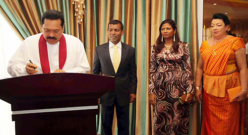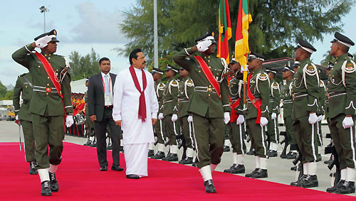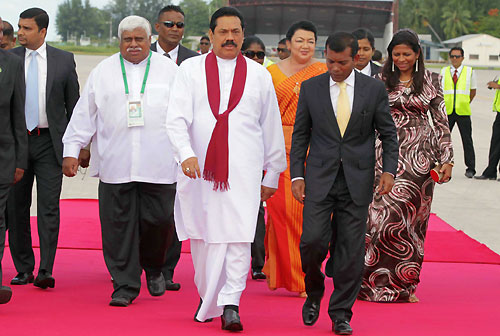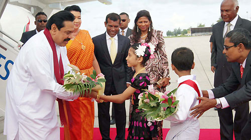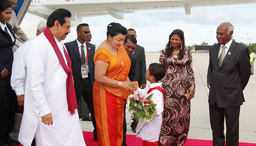 President Mahinda Rajapaksa warmly received upon his arrival to attend the SAARC Head of States Summit by his Maldivian counterpart at the Adduagan airport in the Maldivian southern town of Addu island city this morning on 09 November. President of Maldives Mohammed Nazif, First Lady Madam Laila Ali Abdulla and the Foreign Minister Ahmed Naseem ceremonially welcomed the Sri Lankan President, First Lady Madam Shiranthi Rajapaksa and the Sri Lankan delegation at the airport. The Sri Lankan High Commissioner in Maldives Dickson Dela and the High Commission officials were also present. A guard of honour was also conducted in honour of the President.