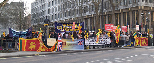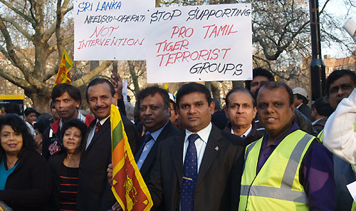Assembled in front of the American Embassy for a peaceful demonstration, which was organised by the British Sri Lankan Forum (BSLF) within a very short notice, members of the forum and participants were shouting slogans, waving colorful lion flags, and holding placards condemning American hypocrisy and double standards against Sri Lanka. The demonstrators, led by two leading organisers of BSLF, Shiran Almeida and Channa were chanting slogans such as: USA Hypocrisy- Sri Lanka Democracy, Hands off Sri Lanka, USA- double game, We love our democracy- USA shows hypocrisy. The placards and huge banners the demonstrators carried read: “Stop the hypocrisy and double standards against Sri Lanka”, “USA pushing for confrontation- Not co-operation”, “Practice what you preach”, “Sri Lanka is peaceful- go and see for yourselves”, “Do not support the Pro – LTTE lobby Groups, they will bring terrorism to your door step”, “Are you paid by the Pro - LTTE lobby Groups?”, “Don’t believe Channel 4 misrepresentation of Sri Lanka”, “Sri Lanka needs co-operation, NOT Intervention”, “Deception by Amnesty International- Funded by pro Tamil Tiger lobby groups”. The demonstrators widely distributed leaflets near the American Embassy, the group has appealed to the British public to visit Sri Lanka and see for themselves the massive reconstruction, rebuilding, infrastructure, development progress and the ground reality in post terrorism Sri Lanka including the former conflict affected areas of the Northern and Eastern provinces. The forum launched this campaign to raise public awareness, saying that Sri Lanka was finally saved from thirty years of devastation at the hands of the most bloodthirsty, murderous group of terrorists, the Tamil Tigers. However, the terror fundraising and propaganda networks are still very much intact outside Sri Lanka. All over the world, the supporters of this vicious group of psychopaths with the blessings of few NGOs are spreading numerous lies and half truths detrimental to our beloved motherland. The totally bias and misleading documentary by Channel 4 about Sri Lanka is just one such manifestation of this movement and requested them not to believe this malicious false propaganda. Addressing the gathering President of BSLF thanked all the patriots who attended and supported the protest to make it a success within a short period of time and said that they organised this event to express their protest against the decision made by the US, against Sri Lanka at the UNHRC in Geneva. He also objected to the unnecessary influences, interferences in to the internal affairs of Sri Lanka by the US-led western countries and regretted the undue pressure from sections of International Community which have fallen prey to the false propaganda. He further stated that BSLF will be handing over a petition to the American Embassy and the Foreign and Commonwealth Office of the British government during the week BSLF is a non- political, independent organisation to safe guard the right image of Sri Lanka which is been distorted by foreign media and pro Tamil Tiger propaganda. It is also committed to safe guard the sovereignty and territorial integrity of Sri Lanka. Our vision would be One County- One Nation and promote peaceful co-existence among all races living in Sri Lanka. Pix by: Nimal Navaratne